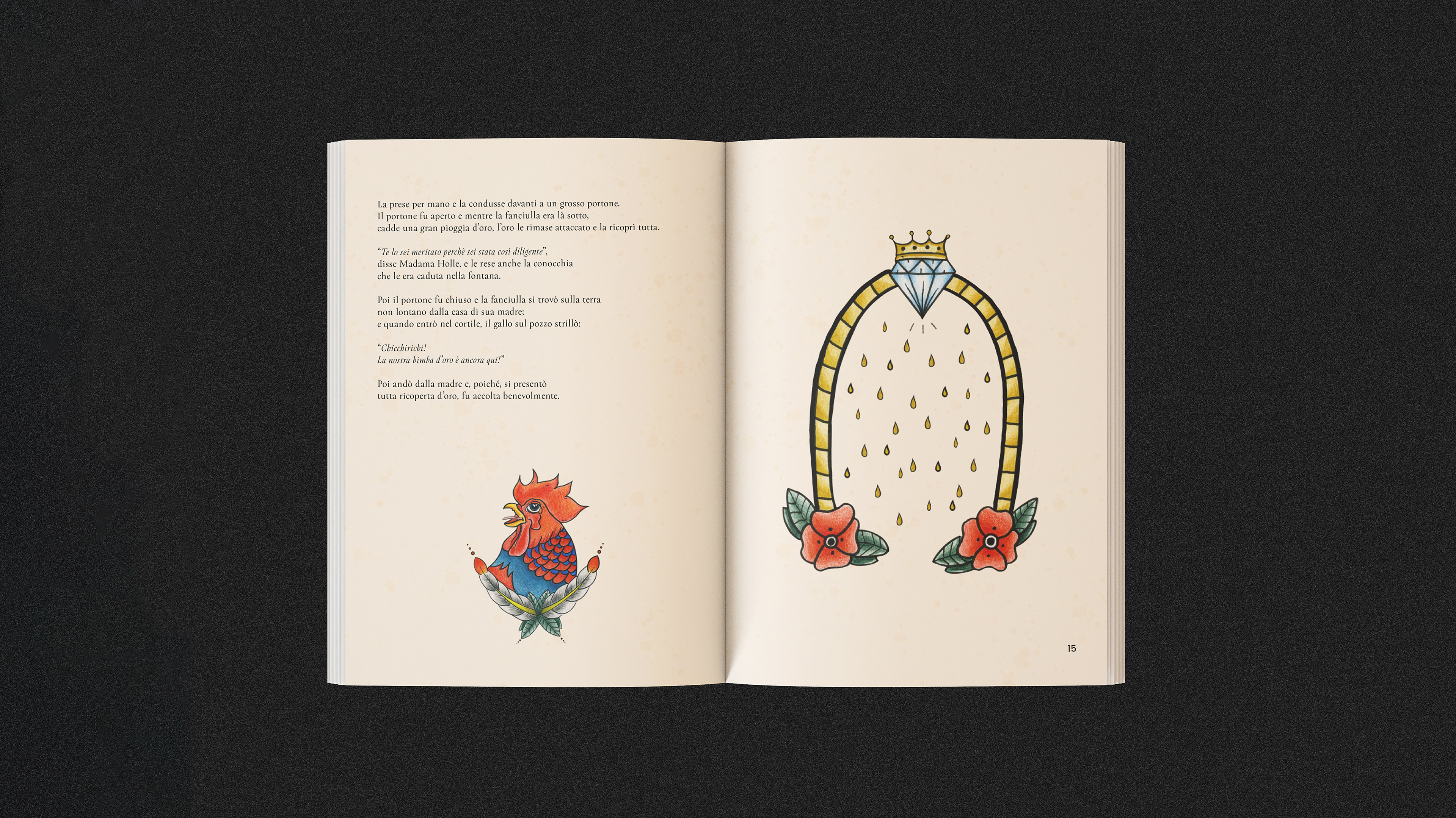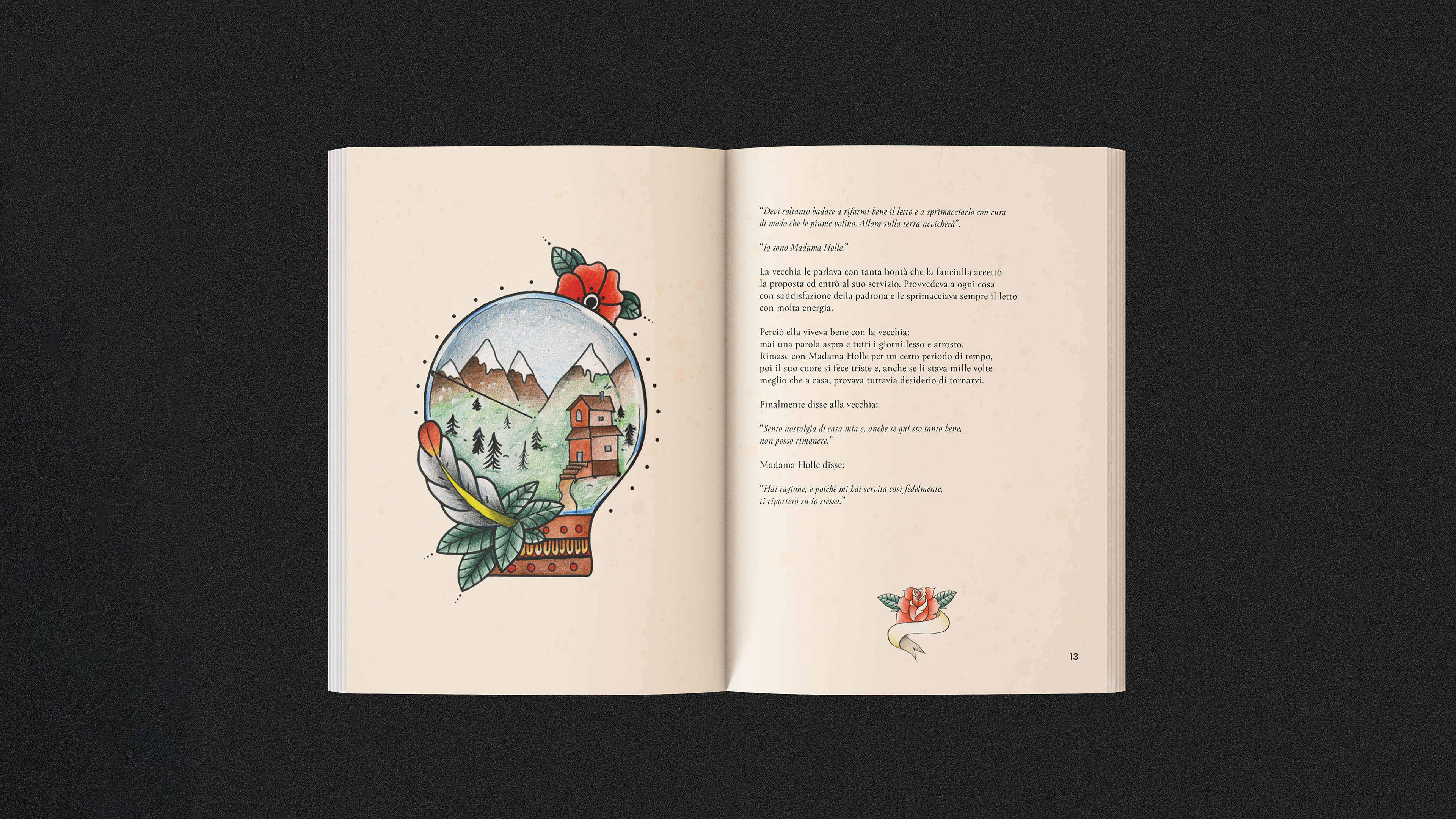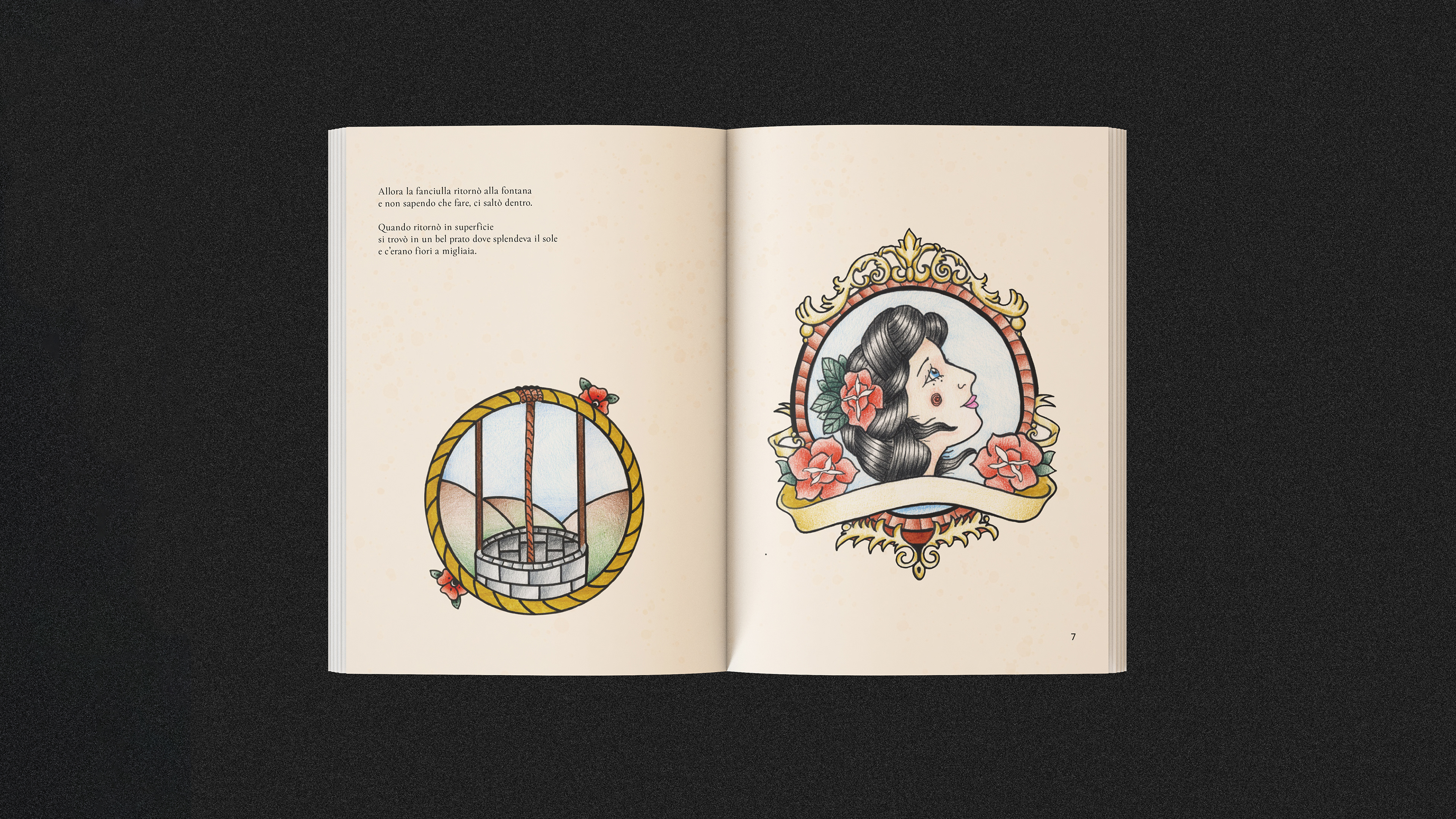 Madama Holle è una fiaba dei Fratelli Grimm. Attraverso questa fiaba ho illustrato un piccolo libro, associando una fiaba classica ad uno stile contemporaneo attraverso un linguaggio visivo del mondo dei tattoo.