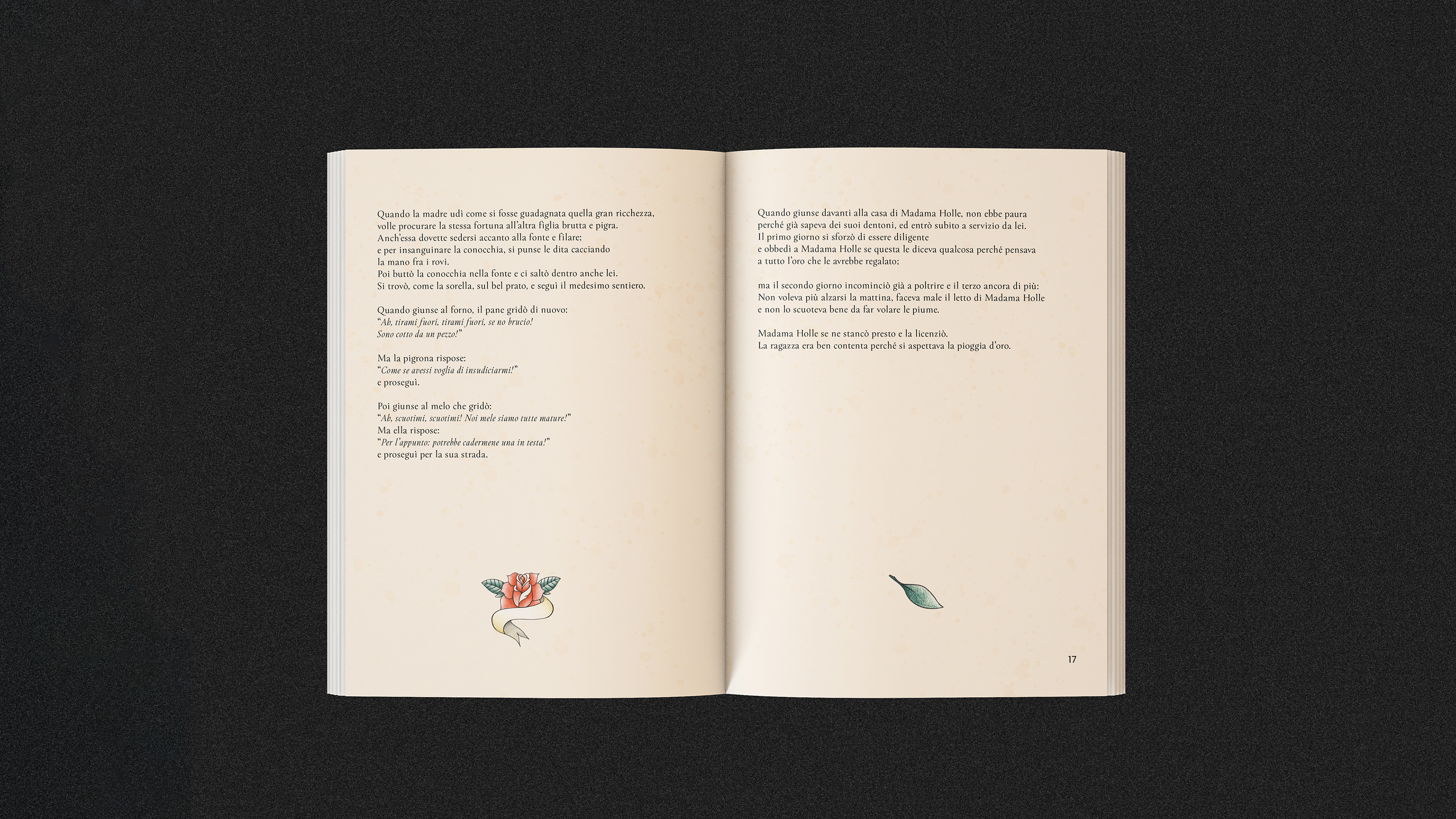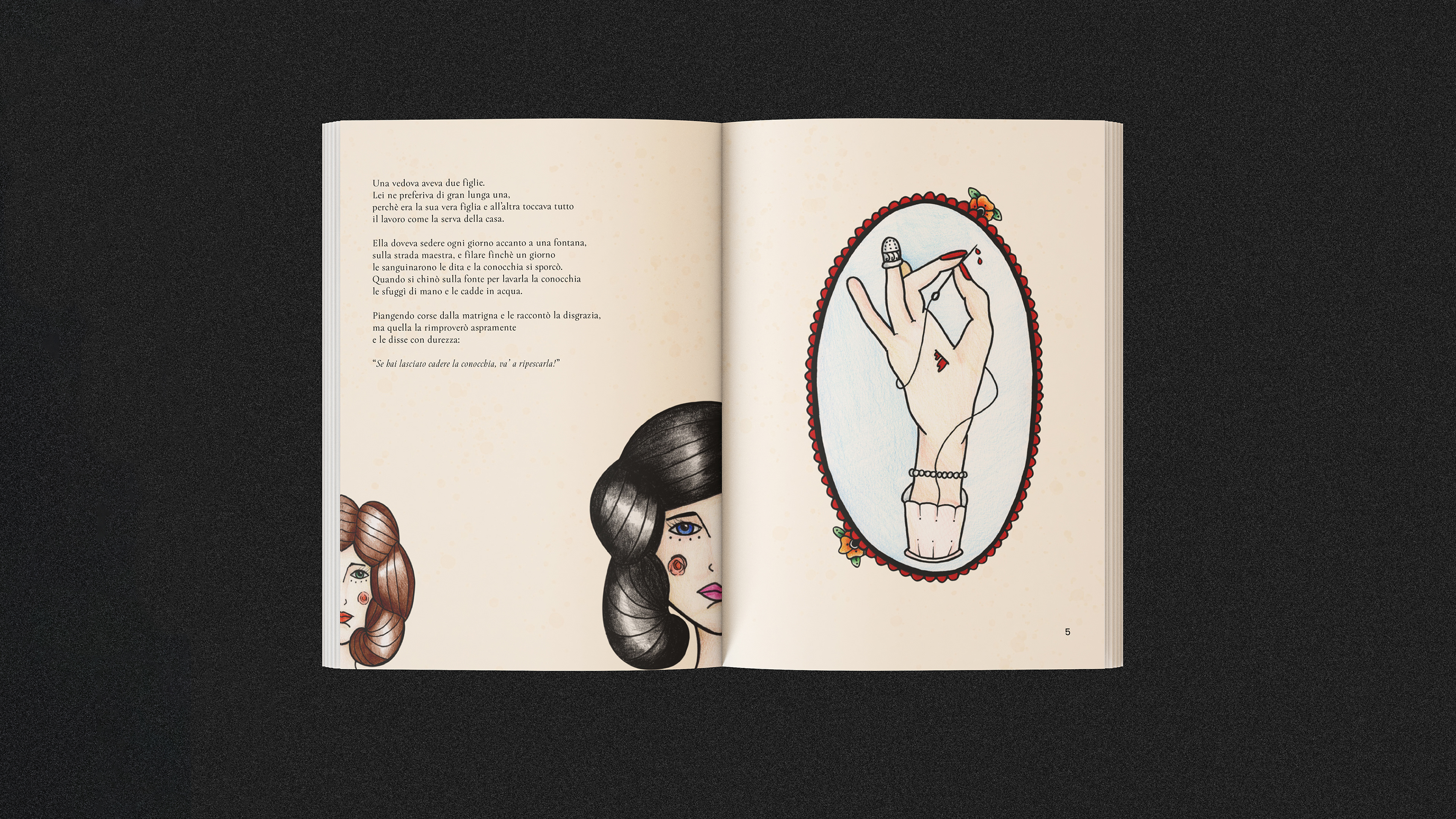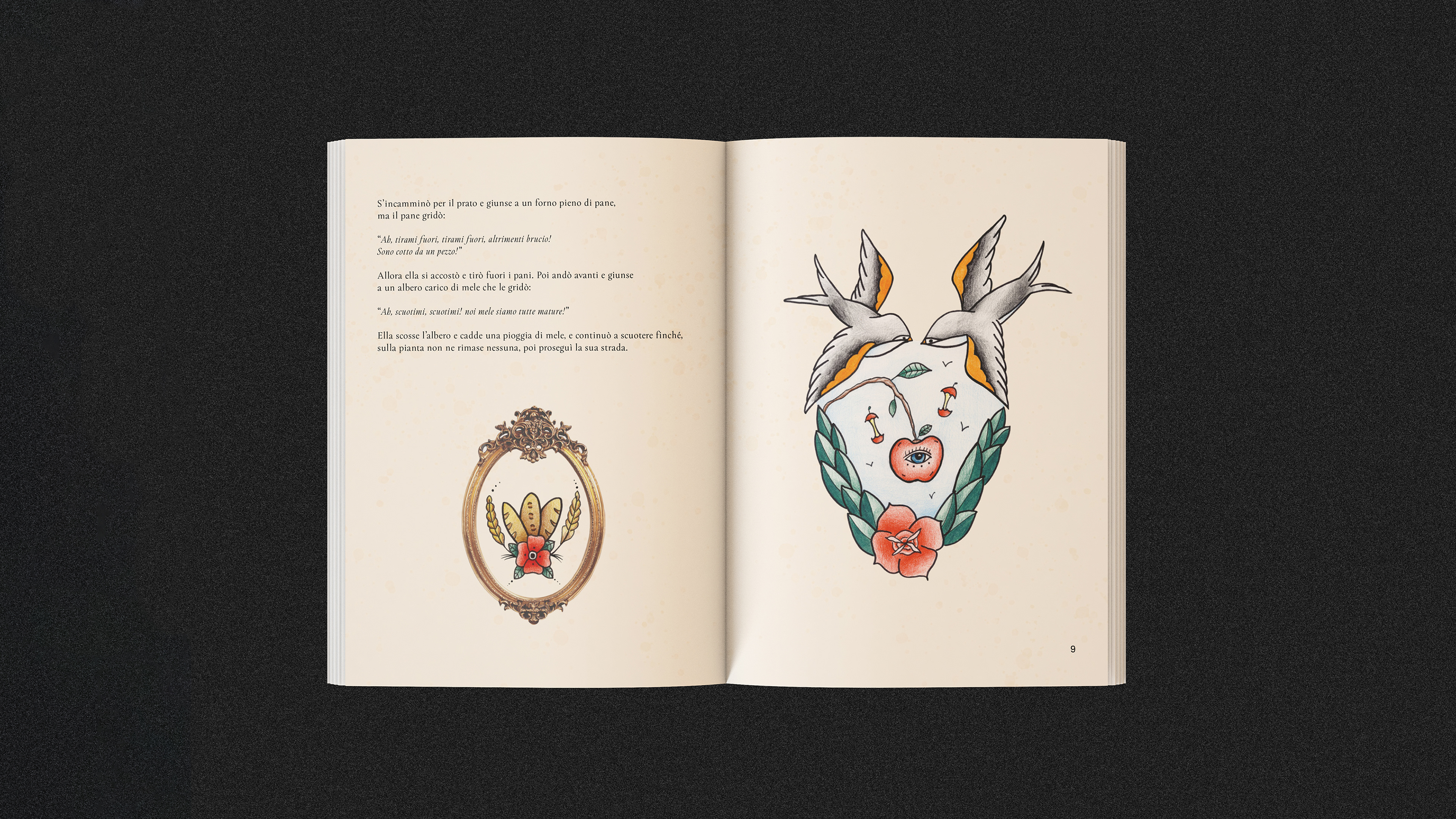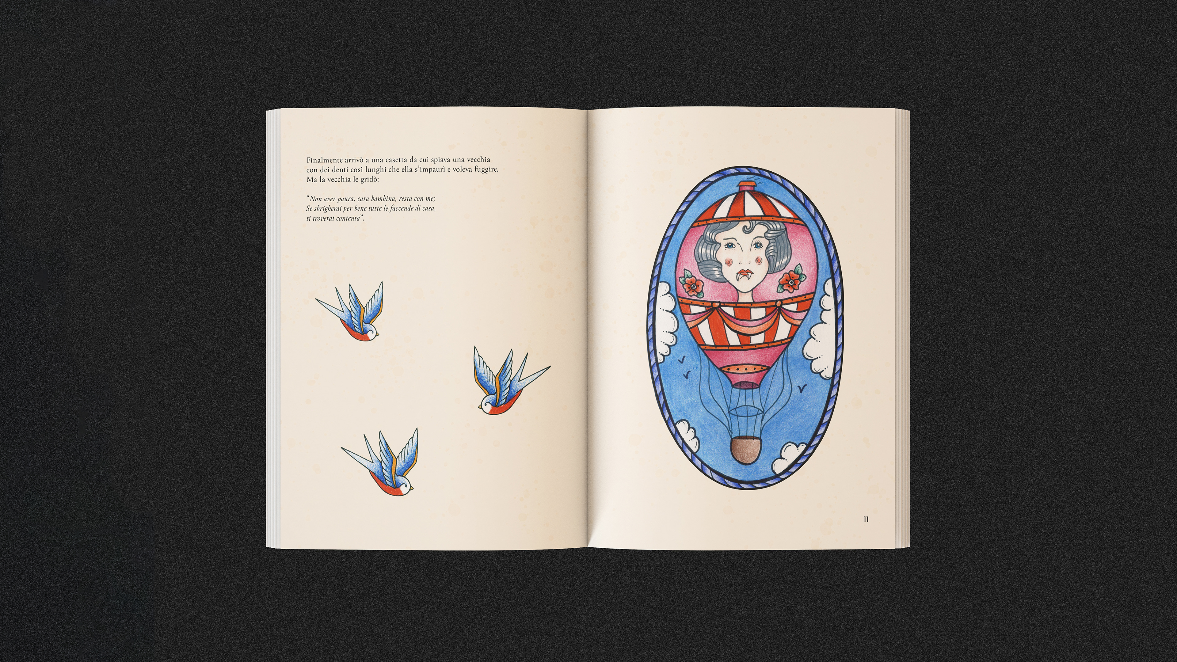 Madama Holle è una fiaba dei Fratelli Grimm. Attraverso questa fiaba ho illustrato un piccolo libro, associando una fiaba classica ad uno stile contemporaneo attraverso un linguaggio visivo del mondo dei tattoo.